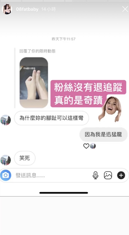 阿乃的「指頭照」一出,便有粉絲私訊詢問,「為什麼妳的腳趾可以這樣彎」阿乃則秉持幽默精神回復「因為我是迅猛龍」接著貼到限時動態自嘲「粉絲沒有退追蹤,真的是奇蹟」。