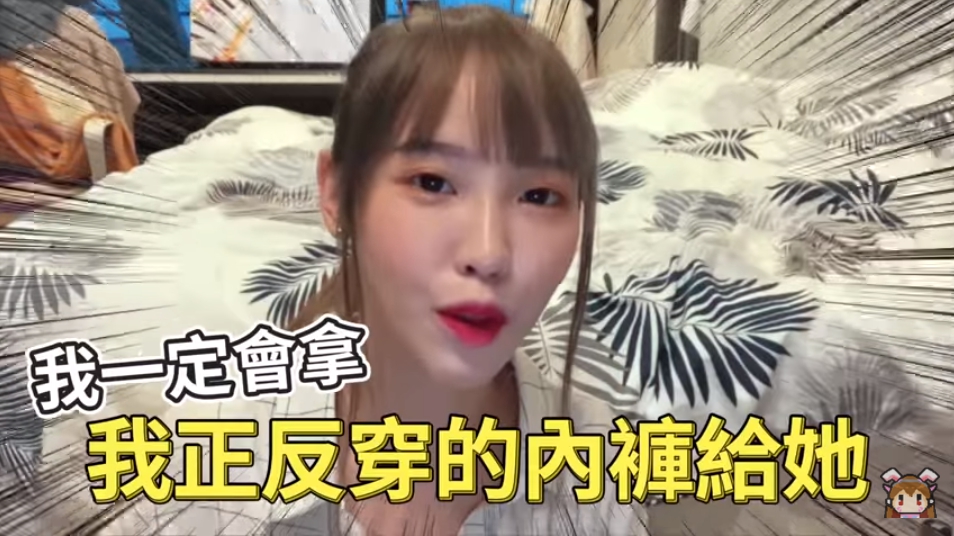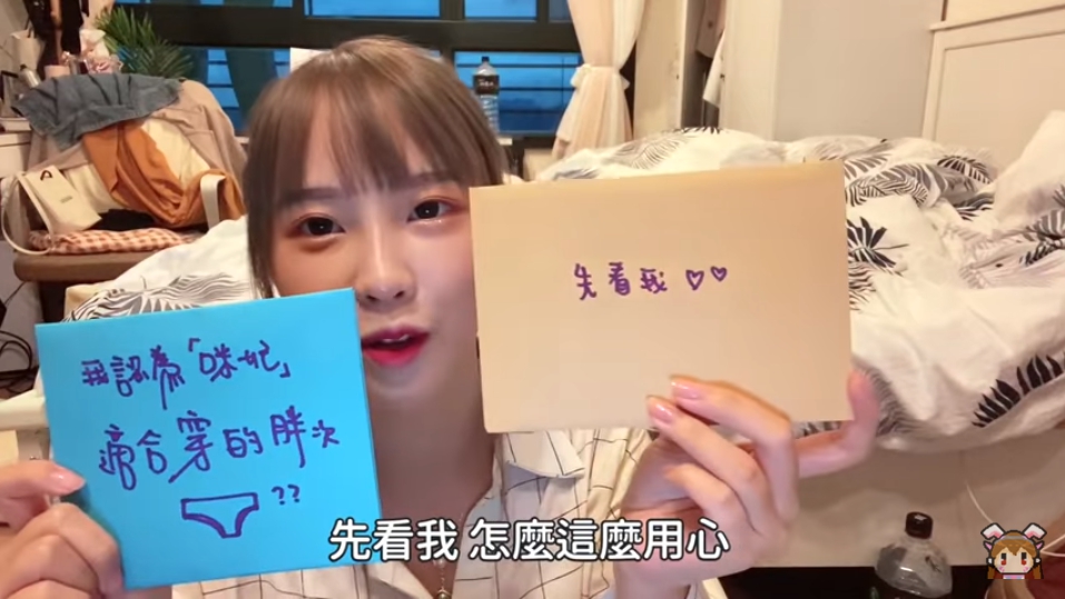 咪妃這次收到邀請,和「解婕翎、魚乾、一隻阿圓、Sandy、可凡、康妮、瑀熙」等人大玩聖誕交換禮物,這次交換禮物的主題是「內褲」,總共要送出一件日常小褲褲,以及一件「一夜情」可以穿的戰袍!咪妃這次收到由魚乾準備的聖誕禮物,影片中可以看到,魚乾送了一件「牛仔褲」造型的日常內褲,而最令人期待的,便是咪妃會收到什麼樣的戰袍?當咪妃拆開「一夜情」小褲褲包裝時,竟然是三件印花造型的「阿嬤內褲」!這個禮物讓咪妃大傻眼狂喊「這是什麼」,魚乾還精心在褲檔部分寫上「訂閱後才開動」,超尷尬位置讓咪妃哭笑不得,對魚乾喊話「妳為什麼要把『咪妃』寫在這裡!」相當爆笑。