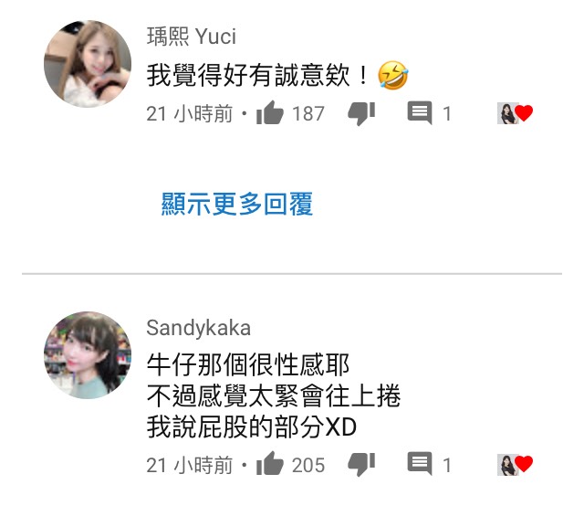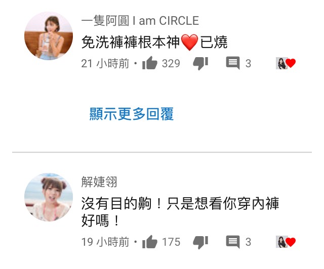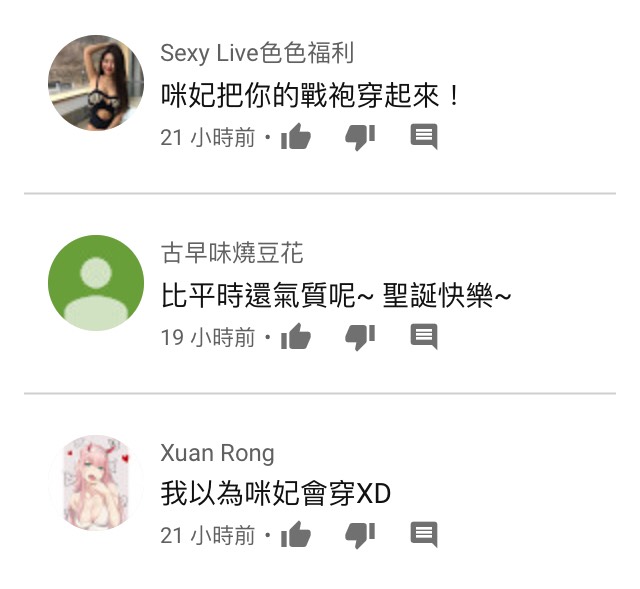 影片一推出也引起網友笑翻,紛紛留言「免洗褲褲根本神,已燒」、「牛仔褲那個很性感耶,不過感覺太緊會往上捲,我說屁股的部分XD」、「哈哈哈哈哈哈笑死!咪妃聖誕快樂!」、「我覺得牛仔褲很適合耶!」、「這阿嬤內褲哪買的到XDDDD」、「男生看到一夜情那組就走掉了吧XD」、「我覺得咪妃會繼續穿她的免洗內褲」。