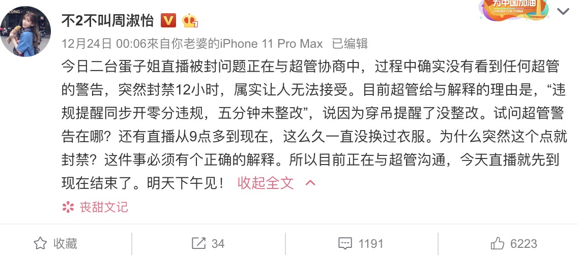 在鬥魚直播平台上有許多身材姣好以及才華洋溢的直播主,其中有一位名為「蛋子姐」是近期時常出現在周淑怡直播間一起搭檔的女主播,就在24號凌晨時周淑怡突然在微博上發文寫下:「今日二台蛋子姐直播被封問題正在與超管協商中,過程中確實沒有看到任何超管的警告,突然封禁12小時,屬實讓人無法接受」,蛋子姐當時在直播時身穿一件吊帶上衣,胸上的區域呈現挖空的狀態,是一件相當正常的服裝,但卻在凌晨時突然收到鬥魚平台的官方警告,接著就被宣告ban台12小時,對此周淑怡也替她的夥伴打抱不平,怒而發文。