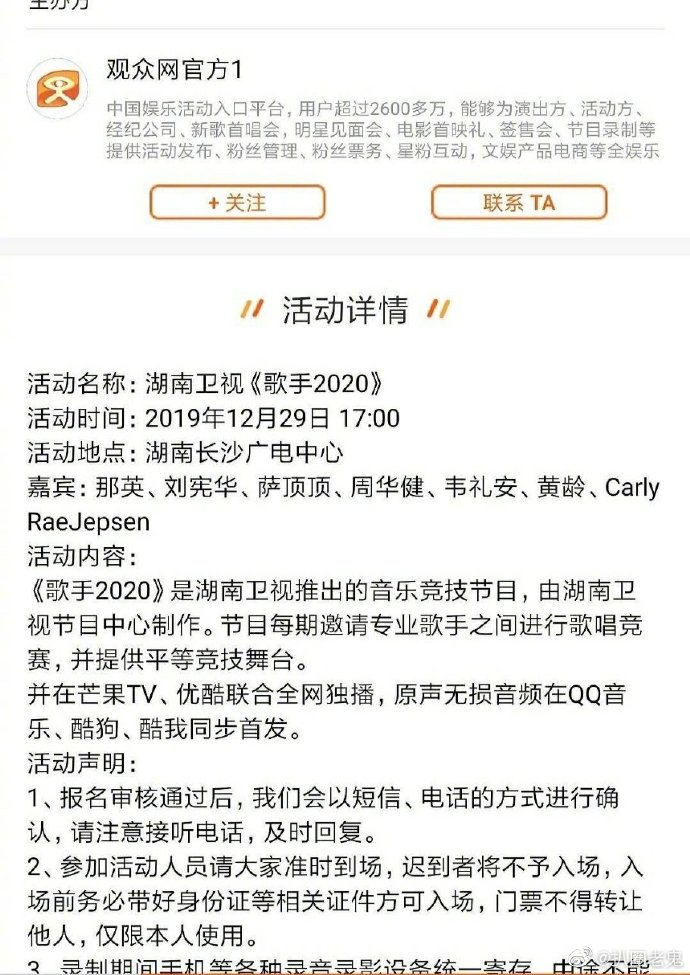 湖南衛視播出《歌手2020》即將在明年開播,每季的卡司陣容都讓網友相當期待,先前也出現過部分來賓歌手名單,但立即被當事人否認。這次有位網友在微博PO出一封來自「觀眾網官方1」寄來的信件,裡面清楚標示出這是來自湖南衛視《歌手2020》的錄影活動通知,時間在2019年12月29日,地點於湖南長沙廣電中心,活動嘉賓竟然有韋禮安!接著便出現了那英、劉實華、薩頂頂、周華健、韋禮安、黃齡與Carly RaeJepsen幾位歌手的名字,顯示這些當紅歌手即將在2020年同台競技音樂。