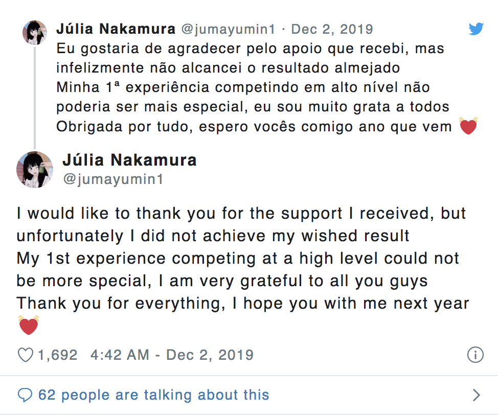 Mayumi也在賽後發布推特表示「非常感謝大家對我的支持,不過很遺憾這次沒有達到我預期的結果。首次參加高強度的賽事,這樣的『第一次』對我來說十分特別,也希望大家在明年可以繼續支持我。」此次Mayumi這一戰在巴西擁有眾多當地粉絲之外,來自各國粉絲也紛紛湧入替他加油、給予鼓勵,粉絲直說:「他戴眼鏡有點像是鬥陣特工的小美」、「好看又好玩」、「笑容好甜美」、「好美」
