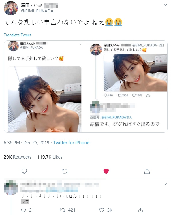 不過沒想到她這則貼文,卻慘遭到粉絲吐槽:「不用了,google一下就找得到了」,讓深田詠美似乎感到十分傷心。在25日,聖誕節當天,深田詠美將留言截圖,並重新發上推特,表示:「不要說那麼讓人傷心的話」。因為未將對方名字打上馬賽克的關係,立刻釣出留言苦主出面回應道歉。該名網友被點名以後,似乎十分緊張,立刻結巴道歉,引發一陣譁然。