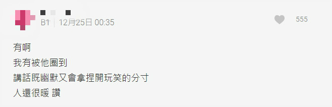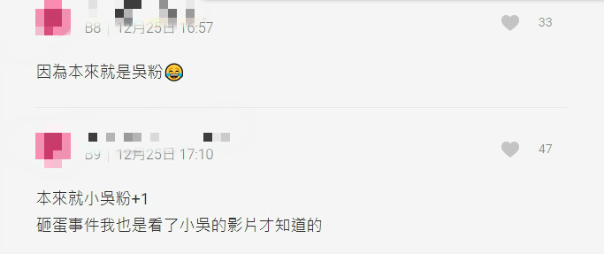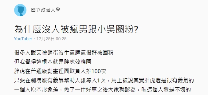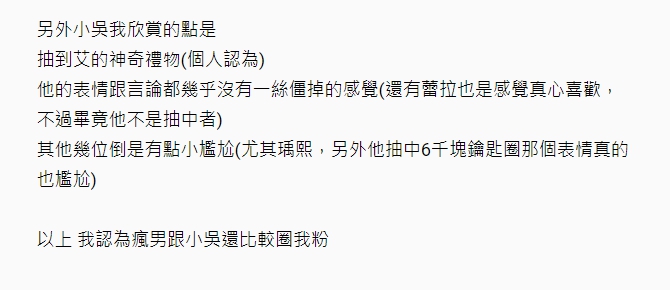 日前,該網友在Dcard貼出標題「為什麼沒人被瘋男跟小吳圈粉?」的文章,內容提到近來在網路上爭議不斷的聖誕交換禮物「砸蛋事件」,他表示除了艾瑞絲以外,瘋男準備的禮物「讓得獎者坐勞斯萊斯出遊」是眾多禮物裡最猛,且有誠意有意義。除此之外,小吳的表現也很值得讚賞,這位網友表示,當小吳抽到艾瑞絲特別的「公益禮物」時,小吳的表情跟言論都幾乎沒有一絲僵掉的感覺,讓人感覺是真心的喜歡這個禮物。這樣大器有愛的表現深受這位網友的讚賞,網友表示「(綜合)以上,我認為瘋男跟小吳還比較圈我粉」