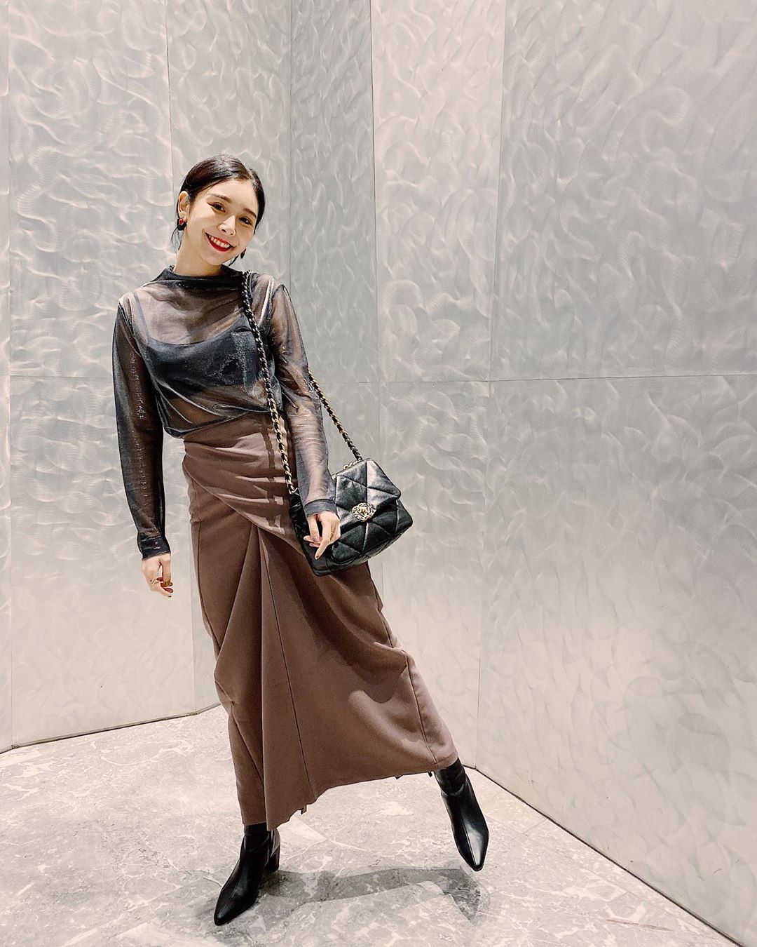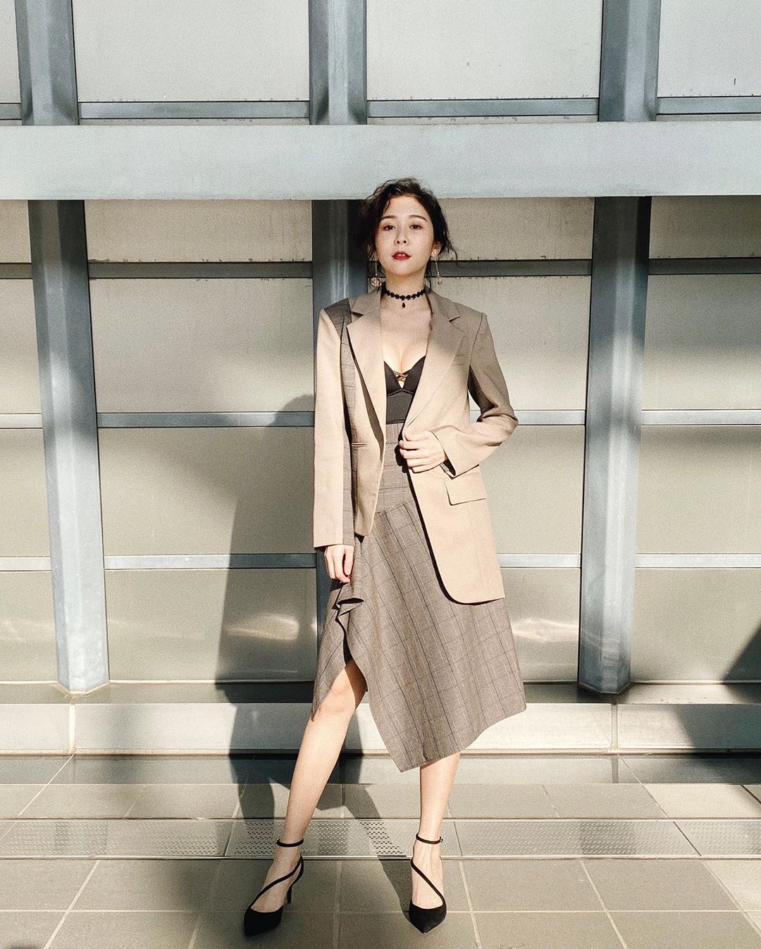 Albee最近在社群平台上貼了幾張照片,透露自己變身「帥帥又壞壞的不良校長」去主持尾牙,從照片中可以看到她隨興扎起頭髮,身穿卡其色長大衣,散發出濃濃的英倫風情,不過最讓人驚訝的,還是她胸前的小心機,當她把外套一敞開,裡頭搭配全黑蕾絲小可愛,中空挖洞的設計,讓她露出了渾圓半球及深V事業線,下身則穿著不對稱剪裁長裙配尖頭高跟鞋,秀出纖細美腿,讓人看了都羨慕不已。