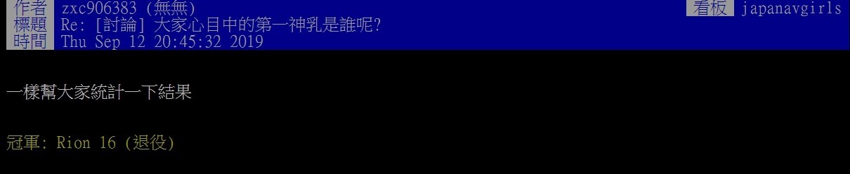 日本成人產業發達,日本AV女星的名氣更是聲名遠播,不分國界深受眾多粉絲喜愛,其中幾位女優的作品更是老司機的珍藏,即使退役了也仍念念不忘她們的作品。近日,有位網友在PTT「japanavgirls」版上票選「大家心目中的第一神乳是誰呢?」引發網友熱烈討論,其中兩名女優「神之乳」RION和「人間最強BODY」沖田杏梨這兩個名字脫穎而出,引發網友熱烈討論究竟誰才值得「第一神乳」的封號。