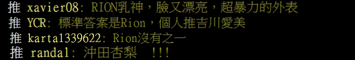 日前有位網友在PTT上發文直問「大家心目中的第一神乳是誰呢?」,問題一出引發老司機們紛紛提出心目中最「胸」女神,這場世紀巨乳對決之中有兩位AV女優RION與沖田杏梨脫穎而出,其中以眾人普遍公認「神之乳」RION獲得最多票數,網友紛紛表示「標準答案是RION」、「RION沒有之一」、「RION神乳,臉又漂亮,超暴力的外表」,可見RION「神之乳」的地位難以動搖,是大多數網友心中「第一神乳」無誤。