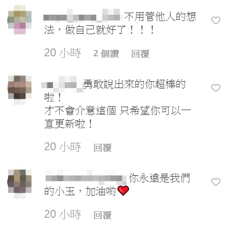 小玉的貼文也獲得網友大力支持與迴響,紛紛留言「你就是你,不管怎樣我都愛你」、「能夠清楚自己的取向也是一種幸福,我們都一樣,願你也能找到愛你都那個人」、「喜歡那個人就勇敢喜歡,不分性別」、「希望你開心」、「這本來就沒有錯,也不影響大家依然愛著你」、「『畢竟只要喜歡,我們真的有需要被框架分類嗎』這句話讚爆!!!」。