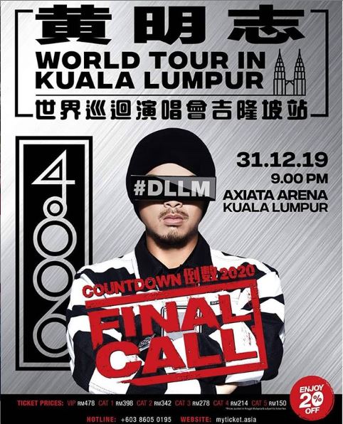 黃明志身為馬來西亞人,一直很希望能在家鄉辦一場大型演唱會。14日時,黃明志透過臉書發布影片,看起來神情憔悴,相當失意。而今天他的好友兼工作人員「神奇傑克」也透露,自從黃明志去年在馬來西亞舉辦演唱會後,就決定要在舉辦一場更家大型的演唱會,為此,他推掉年底所有檔期的工作,包括台北的跨年演唱會,至少有25場商演。