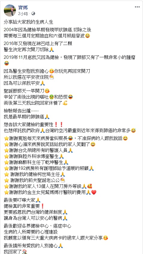 女星寶媽經常上遍各大綜藝節目,也是綜藝圈裡很受歡迎的常客,只是有一段時間變得越來越少看到她出現在螢光幕前,網友們不免也會關心一下她的狀態,沒想到,寶媽27日在臉書發文說自己得了「肺腺癌」,還說她其實在2004年跟2016年都有被診斷出罹患「甲狀腺癌」,讓網友們驚呼不已,紛紛心疼她的遭遇。