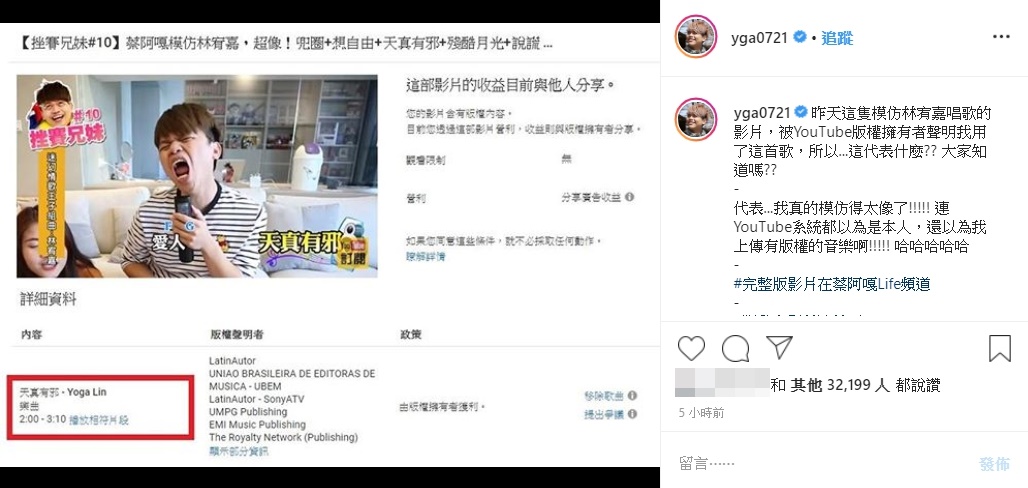 影片上傳約一天後,蔡阿嘎在IG公開「Youtube版權聲明」,其中指出蔡阿嘎在影片中,使用了「天真有邪」這首歌曲,因此收益將與他人分享。然而這也代表,蔡阿嘎模仿得十分成功,讓Youtube系統誤以為是本人歌聲,判斷影片中用了有版權的音樂!貼文一出,引來不少粉絲笑翻表示,「阿嘎笑了宥嘉哭了」、「這誤會大了」、「Youtube累了」。