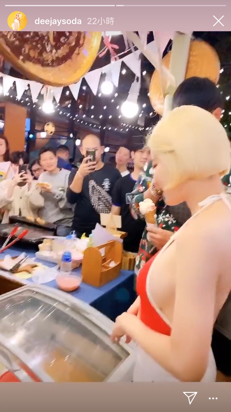 而DJ Soda似乎也在市集中,搜刮了不少好貨。隔天(27日),她在IG上PO出貼文,秀出自己所購買的戰利品。影片中,DJ Soda穿著一件相當具有東南亞風情的繩結上衣,並在一片花園中玩耍。因為沒有穿內衣的緣故,她豐滿的上圍好幾次呼之欲出,尤其是彎腰的時候,衣領大開,讓她白皙的大片「胸前風光」直接暴露在鏡頭底下。