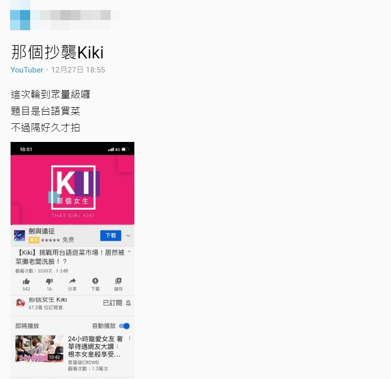 近日,Kiki在頻道中上傳新影片,挑戰用台語逛菜市場,然而影片發出不到一天,便有網友發現這支影片題材跟「眾量級」一樣,因此轉發到Dcard直批「那個抄襲Kiki」,掀起一波討論,引來不少人紛紛留言表示,「真的臉皮很厚」、「能夠一而再再而三不怕被檢討的勇氣到底是誰給的拉」、「抄襲Ki,真的喜歡不起來」同時網友們也挖出黑歷史,貼出許多Kiki疑似抄襲的影片對比圖。