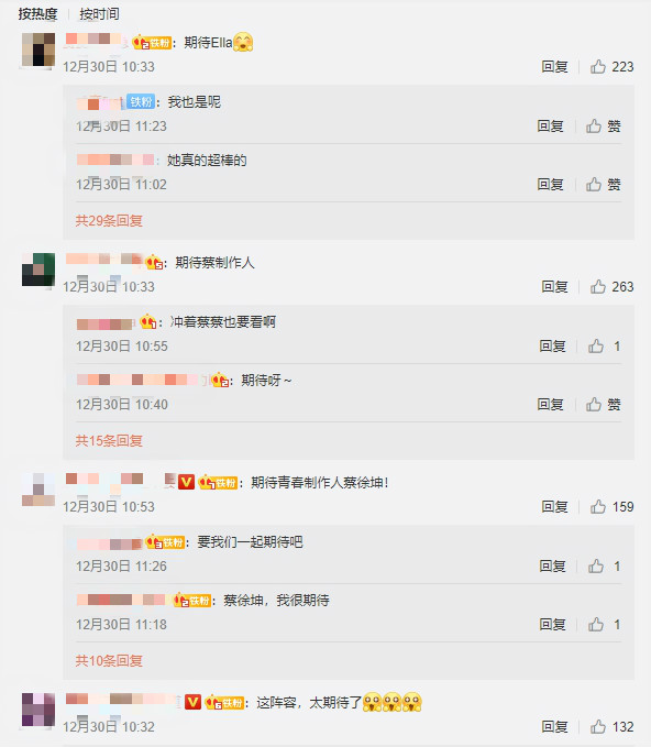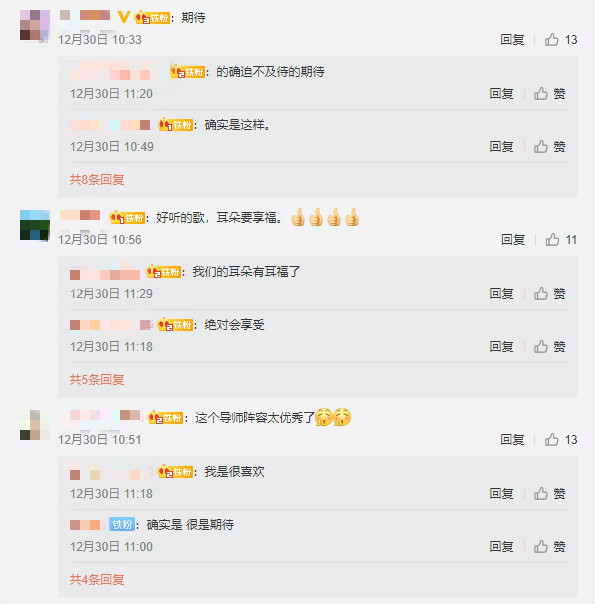 網友們紛紛湧入官方貼文底下留言,「本來我都不打算看的,現在突然就很期待很想看」、「好聽的歌,耳朵要享福」、「絕對會享受」、「這個導師陣容太優秀了」、「我是很喜歡」,除此之外也有多位導師的支持者浮出水面表示大力支持偶像,「期待看導師lisa和ella呀」、「特別喜歡陳嘉樺,必須轉發一下」、「期待青春製作人!」