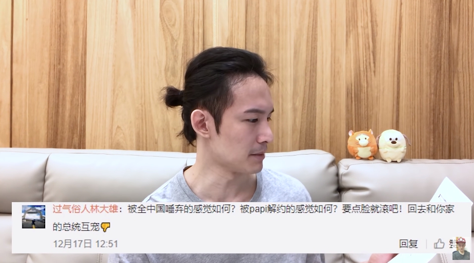 他接著回應「被全中國唾棄的感覺如何?被papi解約的感覺如何?要點臉就滾吧!回去和你家的總統互寵。」,他表示除非是習近平出來問他,不然這位網友不太可能代表全中國的人唾棄他,接著回應關於被解約的感覺,他表示:「就是少賺了一點而已,反正錢再賺就有了」,反觀民主自由是不能失去的,一旦失去便要用血用生命換回來,他遺憾表示:「香港的朋友已經示範給我們台灣人看了」