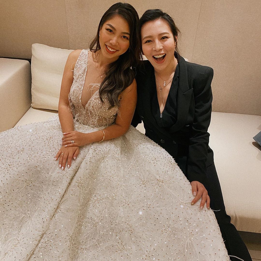 不過,當我們看到另一張她和新娘的合照時,隱藏在西裝外套裡面的深V剪裁設計,讓大家可以看到她脖子上的細Y項鍊,一路就這樣延伸到深溝裡去,完整的隱沒在性感的深溝,特別引人遐想!網友們看完也都紛紛留言表示,「這腿大概長2米吧!」、「太美了~」、「美美的!」、「真的好帥」、「好看到不行」、「又帥又禮貌重點超瘦!」、「又美又有禮貌」。