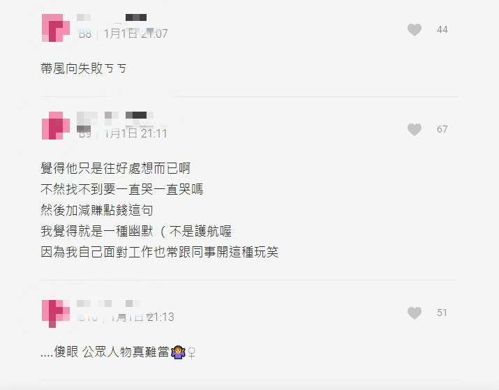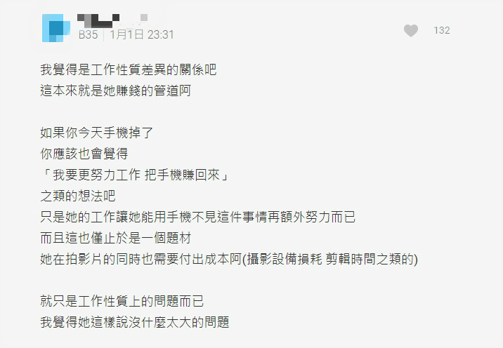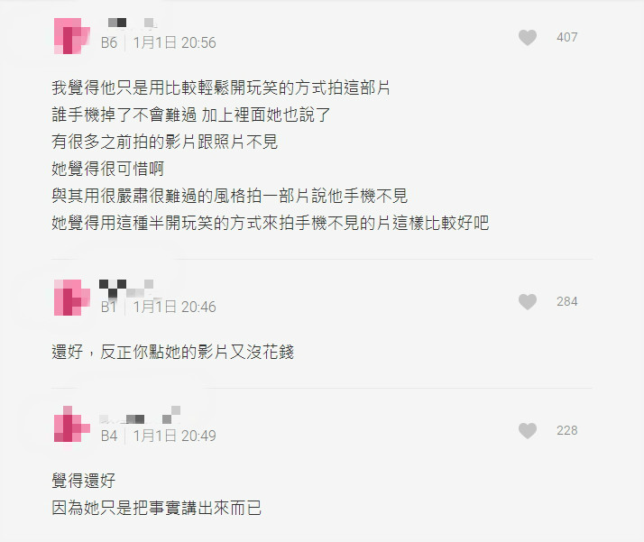 這篇貼文立即引發網友紛紛湧入留言討論,有網友表示覺得愛莉莎莎只是用比較輕鬆的玩笑拍片,並不代表她不在乎手機不見這件事,也有網友說:「覺得還好,因為她只是把事實講出來而已」、「覺得他只是往好處想而已啊,不然找不到要一直哭一直哭嗎」、「傻眼、公眾人物真難當。」
