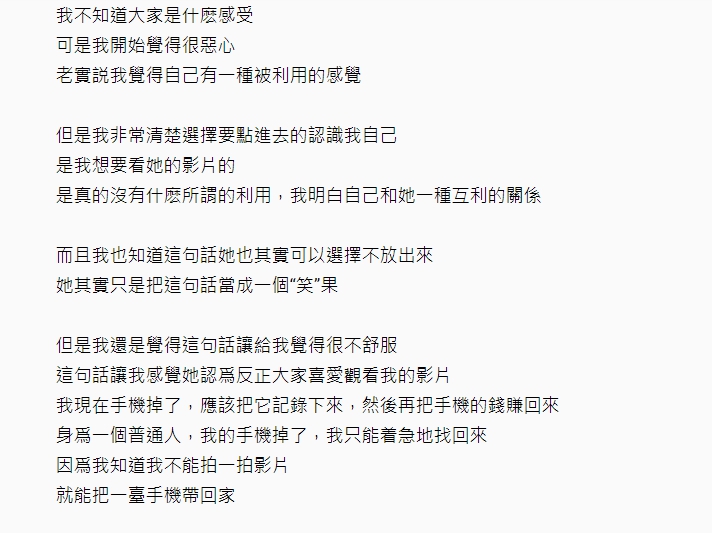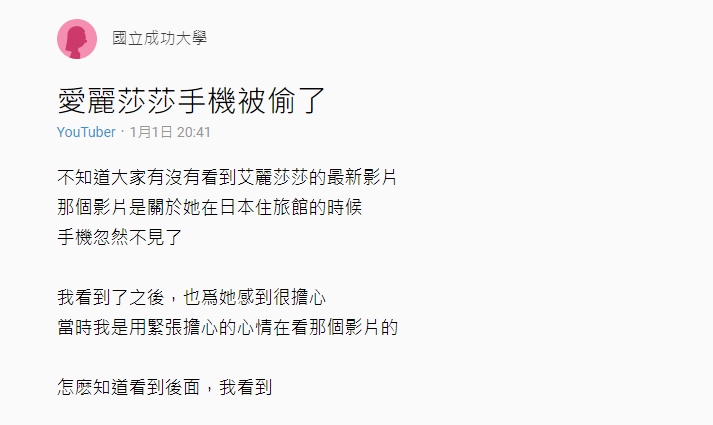 知名Youtuber愛莉莎莎時常在網路上大談感情觀與分享出國留學旅遊介紹等題材,在Youtube平台上擁有89萬粉絲追蹤,外表甜美個性活潑大方的她熱衷於公開分享自己的生活,擄獲不少死忠粉絲支持。日前,愛莉莎莎上傳一則她去日本旅遊時手機被偷的影片,卻引來某位網友在Dcard上批評,表示愛莉莎莎在這支影片裡的言論讓人覺得被利用,感覺很噁心。