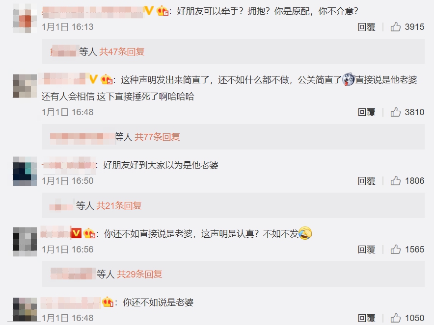 對於經紀公司的聲明,讓網友們看了完全無法接受,紛紛猛留言表示,「不如不要解釋了!我的天,當觀眾都是瞎子?」、「原來朋友還可以擁吻的啊?」、「還不如不要發聲明,這個聲明整個跟實錘一樣!」、「好朋友是那樣的?當我們眼睛瞎???」、「這解釋好隨意啊~跟實錘似的,還是希望他好吧!畢竟是我小時候最喜歡偶像劇男主角啊!」、「好朋友好到大家以為是他老婆」不過,也有網友力挺,「我們相信小美,他不會做出傷害家人的事情」。