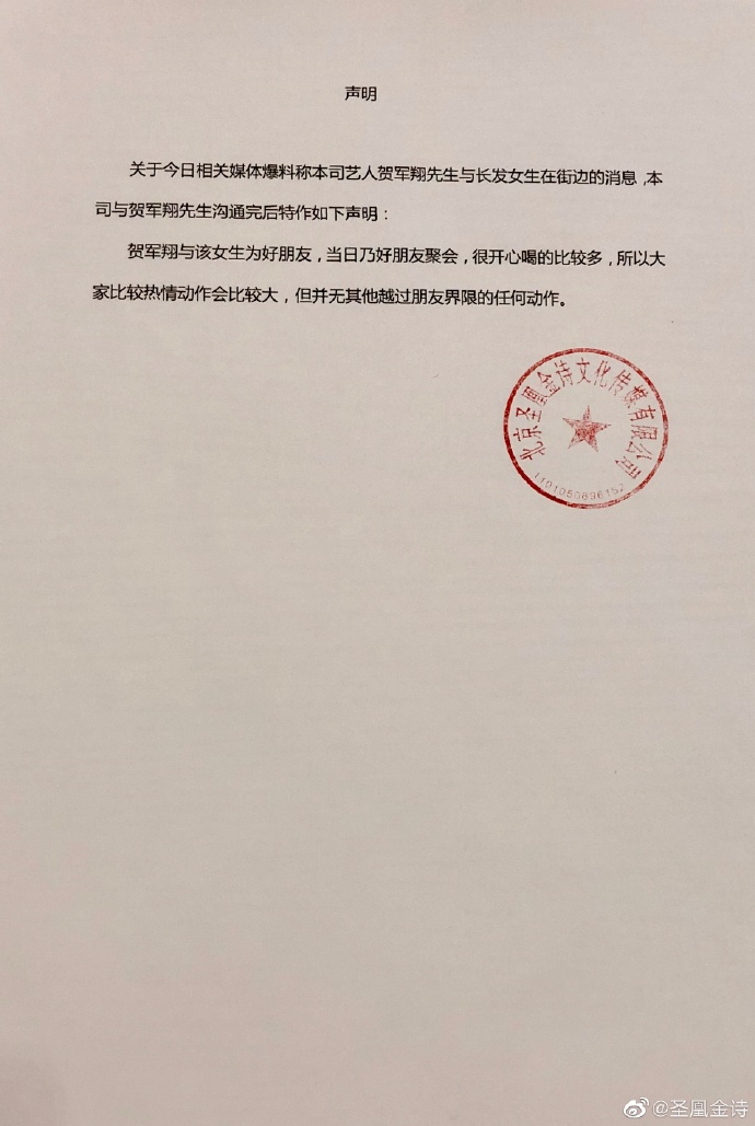 而賀軍翔的經紀公司也在沉默了半天後,發出聲明回應賀軍翔跟長髮女的關係,「跟藝人溝通完後,確認賀軍翔和該位長髮妹只是好朋友」,還說那天晚上是好朋友的聚會,因為情緒高昂加上喝的比較多,「大家比較熱情,動作就會比較大,但並沒有其他越過朋友界線的舉動」。