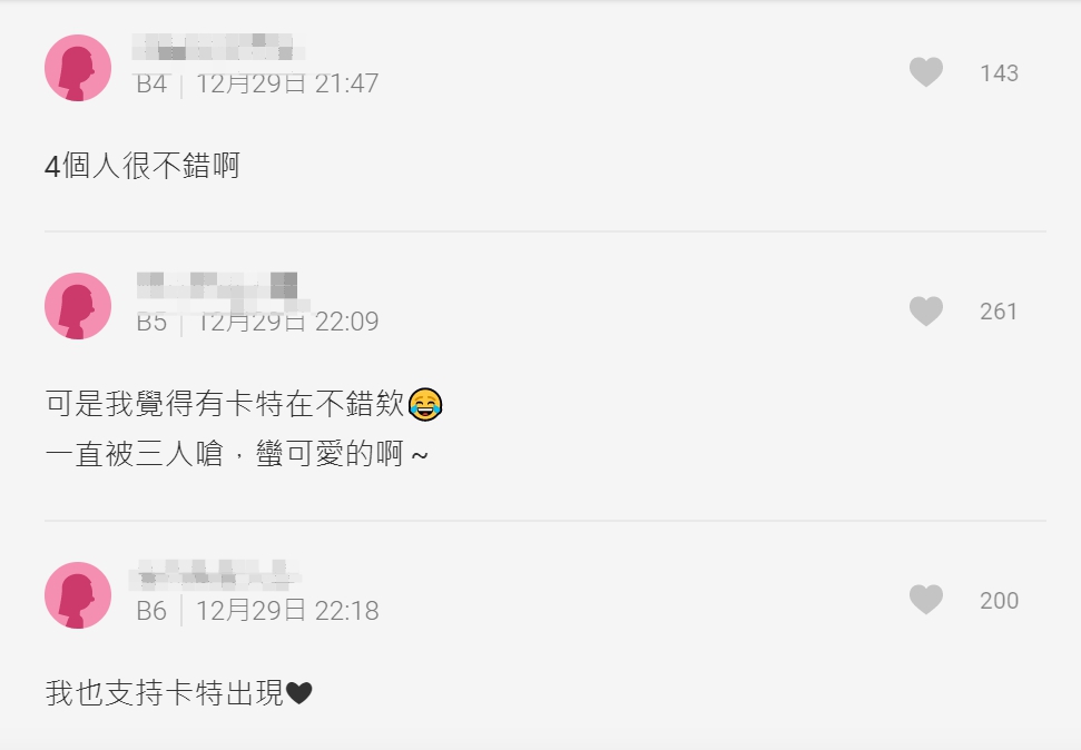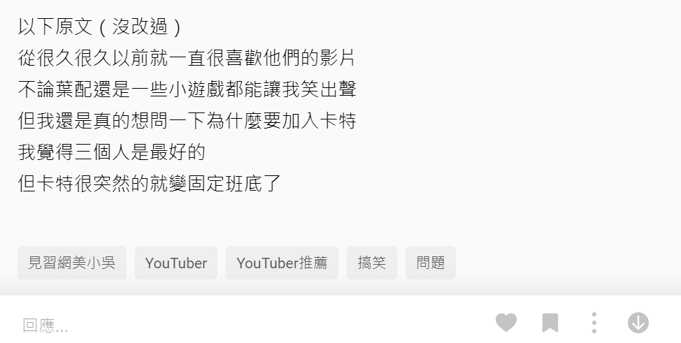Dcard有網友近日發文,表示很喜歡小吳的影片,但是由於成員卡特比較安靜,和其他三人活潑豪放的風格相差較大,因此原PO對於卡特的加入抱有很大疑惑,更直言「我覺得三個人是最好的」。該篇文章引起廣大網友熱烈討論,有人留言表示「個人覺得卡特沒什麼輸出,而且給人的感覺太軟了沒什麼精神,其實三個人就夠了」、「我也不懂為什麼要加他哈哈,沒有比較有趣」,隨後還衍伸出另外兩篇觀點相似的文章,甚至逐漸偏向人身攻擊。