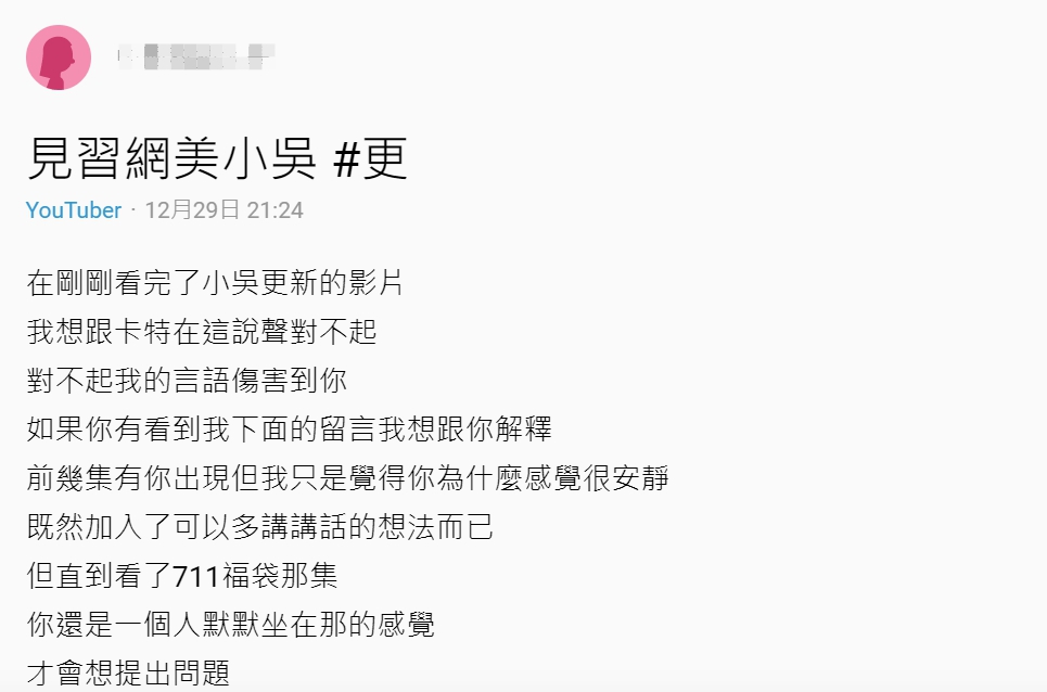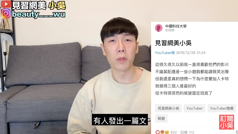 「見習網美小吳」是一名YouTuber,因擅長解析12星座,所以號稱「新店唐綺陽」,而他經常和朋友Yoyo、聖元、卡特等人一起拍攝實測、搶答系列影片,搞笑幽默的風格深受粉絲喜愛,頻道目前累積將近57萬訂閱。然而近日卻因為Dcard接連有網友發表「卡特不適合團隊」的言論,讓小吳特別在1日上傳一支影片,回應網友質疑,並且力挺卡特「團隊每個人都是一首歌的旋律」。