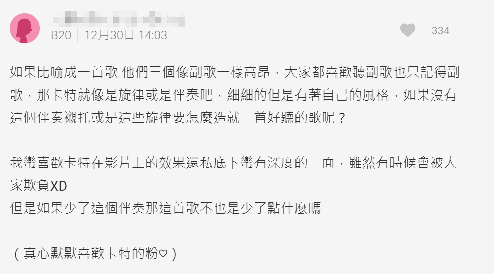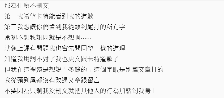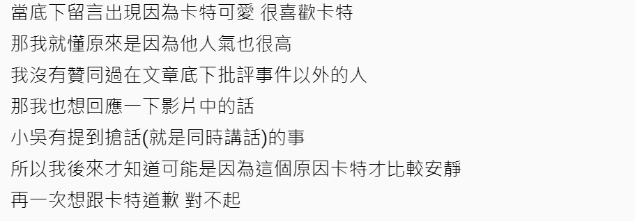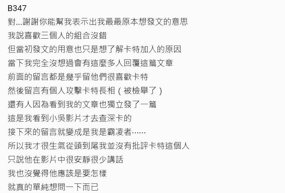 小吳影片推出後,Dcard原PO也更新文章並向卡特道歉「對不起我的言語傷害到你」,並否認自己認為卡特是「多餘的」成員,表示當初發文的用意只是想了解卡特加入的原因,「從頭到尾我並沒有批評卡特這個人,只說他在影片中很安靜很少講話,我也沒覺得他應該是要怎樣」,看了小吳影片中解釋卡特努力和團隊磨合的過程,才理解了卡特少講話的可能原因。