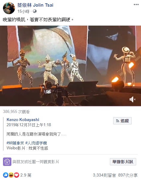天后蔡依林元旦繼續展開第三場「Ugly Beauty」演唱會,就算已經連唱三場,她也依然戰鬥力十足,完全沒有任何疲憊感,讓粉絲們看了都覺得非常過癮,沒想到最近有網友在臉書發文貼出一段演唱會片段的影片,並寫道,「周圍的人是在聽你演唱會就夠了...」引起了網友們熱烈的關注跟討論,而蔡依林看完影片之後也轉發,讓大家看了都笑到瘋掉!