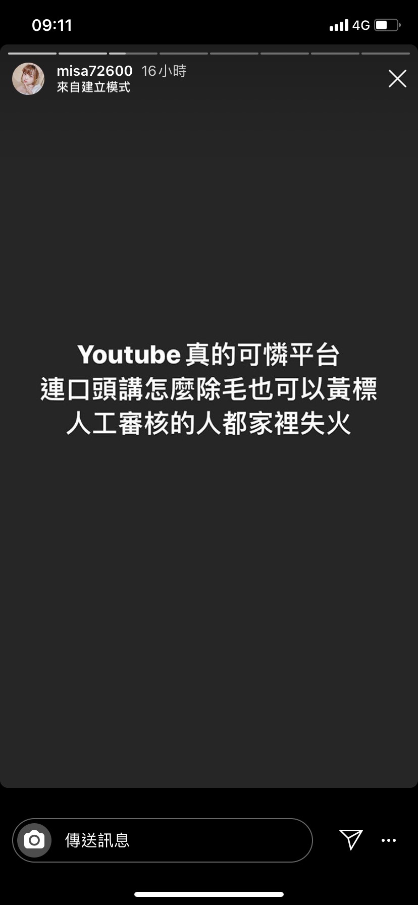 米砂日前上傳新影片,以口頭述說的方式拍攝除毛教學影片,沒想到卻被YouTube「ban」掉,因此她在IG怒嗆「YouTube真的可憐平台...人工審核的人都家裡失火」,氣憤表示「辛辛苦苦地做出一則符合規定的東西出來,別人連看都沒看就覺得那是黃片」,她認為YouTube影片審核人員對她有特定標準,指出「別人亂開黃腔就沒事啊,我正正經經教個東西就黃標」,怒控YouTube影片審核規則「根本是參考用,判定完全超主觀」。