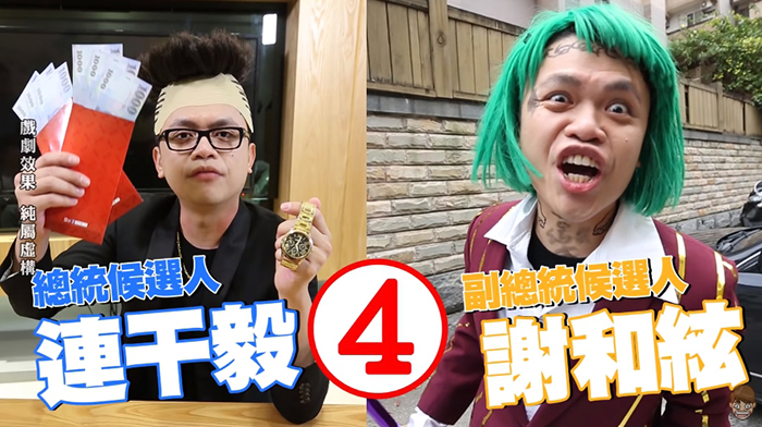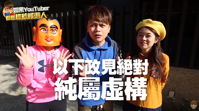 知名網紅蔡阿嘎本名蔡緯嘉,自從2008年起在部落格上傳愛台灣為主題的時事影片後一炮而紅,以搞笑諷刺時事的影片風格吸引無數粉絲追蹤。大選將近,為了呼應時事他推出全新影片「如果YouTuber參戰2020總統大選!」,並在標題上寫著與多位知名網紅合作,影片上傳不到24小時便吸引57萬次觀看數,有3萬人按讚、3千則留言。