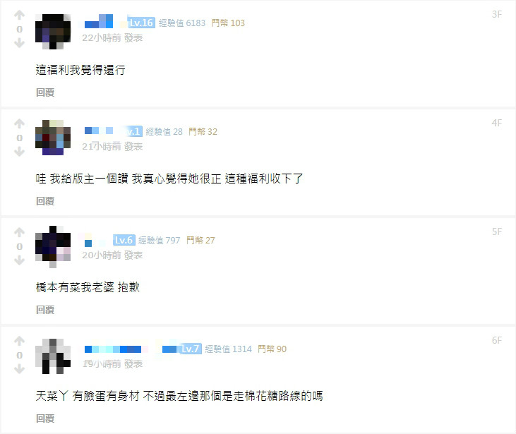 「最強美腿」的性感COS照被網友輾轉分享,便有網友在底下留言表示:「給板主一個讚,我真心覺得她很正,這種福利收下了」、「這福利我覺得還行」、「天菜阿,有臉蛋有身材!」,更有網友逗趣回應:「橋本有菜我老婆,抱歉」