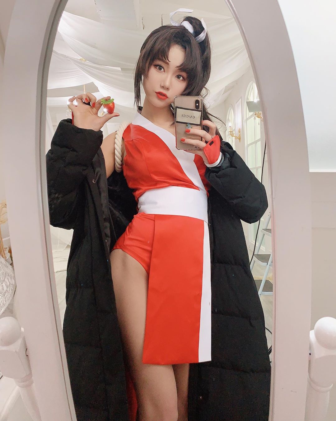 去年底時,Berry在網上放送最後一波福利,在網上分享出自己扮成遊戲角色「不知火舞」的照片,引起一陣熱議!照片中,Berry為了如實還原角色,將頭髮高高豎起,並用白色髮圈綁起,而她的裙子更是短到胯骨,大露一雙穠纖合度的美腿。也許是冬天過於寒冷的關係,Berry還加上一件大外套,讓她的身材在外套中,若隱若現,顯得更加誘人。