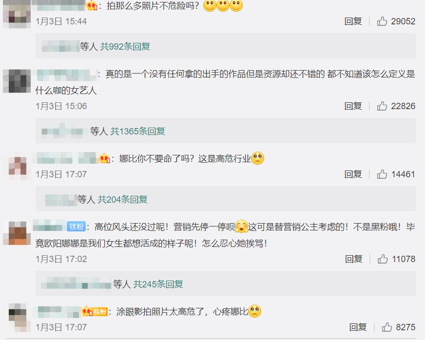 不過先前歐陽娜娜因為轉發宋佳悼念高以翔的貼文,內容提到「藝人是高危險行業」等語引起爭議,許多人認為她只是想炒作新聞,並非真心關心高以翔,更諷刺她平常曬美照是高危險職業,而這次也有大批網友留言:「塗眼影拍照片太高危了,心疼娜比。」、「別化妝了,太高危了。」、「塗眼影有危險,娜比不要塗,快休息。」、「銀色眼影弄到眼睛裡怎麼辦?這麼高危。」