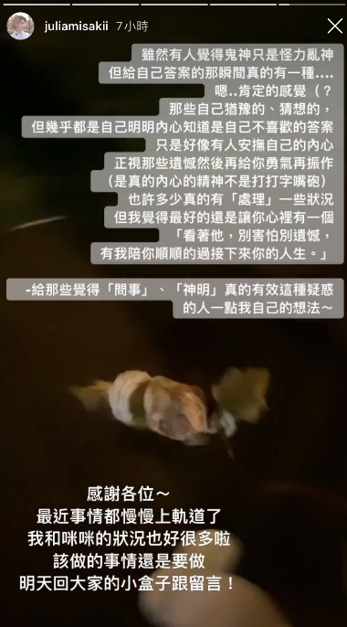 另外咪妃也在限時動態中,分享她對「鬼神」的看法,她認為當對方給自己答案那瞬間,自己有一種被肯定的感覺,那些曾經猶豫、猜想的都獲得了答案,而她也認為可以藉此正視那些遺憾,鼓起勇氣振作,在心理層面上有了安撫。