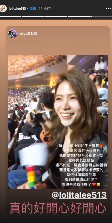 蘿莉塔在限時動態中感動地寫下,「史上最浪漫的生日禮物,我從來沒收到禮物哭過,真的太驚喜了!謝謝亞~Jolin我來了!」而斯亞也在限時動態發文回覆說,「買給這位小姐的生日禮物!千辛萬苦真的一番波折~我搶票搶得好辛苦都買不到,覺得與其送精品,還不如送一場會非常難忘的禮物,而且是大家夢寐以求想要的,蔡依林演唱會的票!看到莉塔開心地哭了,覺得辛苦都值得了!」