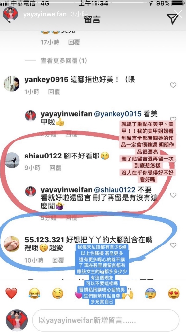 除了批評腳不好看的留言,從丫丫的截圖中還能看到,有人留下明顯構成性騷擾的言論,對此丫丫也無奈表示,「我每天私訊都有至少5條以上性騷擾,甚至更多,還有更多噁心的就不講了!」同時丫丫提到,希望習慣私訊講噁心話的男生可以有點自尊,並多多充實自己,別再做一樣的事情。