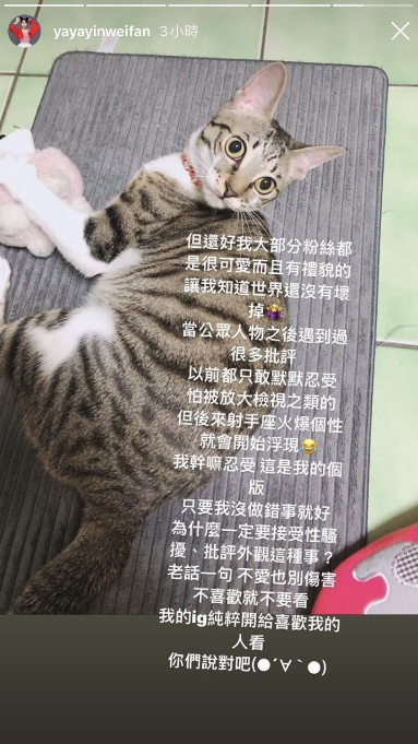 丫丫隨後也提到當了公眾人物之後,很常收到許多批評,原本只敢默默忍受,怕被放大檢視,但是隨著時間過去,丫丫的火爆個性再也藏不住,丫丫表示「我幹嘛忍受?這是我的個版,只要我沒做錯事就好,老話一句,不愛也別傷害,不喜歡就不要看」,丫丫決定坦然做自己,有話直說的個性也圈了不少粉!