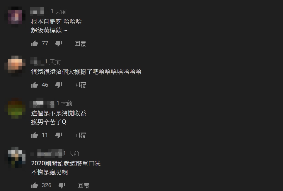 影片一出,超狂重口味內容隨即引起熱議,網友紛紛留言大讚「根本自肥呀,哈哈哈,超級黃標欸」、「2020剛開始就這麼重口味,不愧是瘋男啊」、「這個是不是沒開收益,瘋男辛苦了Q」、「艾瑞斯太犧牲啦!這樣爽到晨灰ㄟ哈哈!」、「整部影片我都在笑,不間斷,笑到我快斷氣了!!!!」、「爭議很大的影片,但.....這就是瘋男風格,艾瑞絲的反應也很有梗,發光笑噴,加油」、「視黃標如浮雲了,夠狂我喜歡」、「這可能是我覺得最好看的一集」。