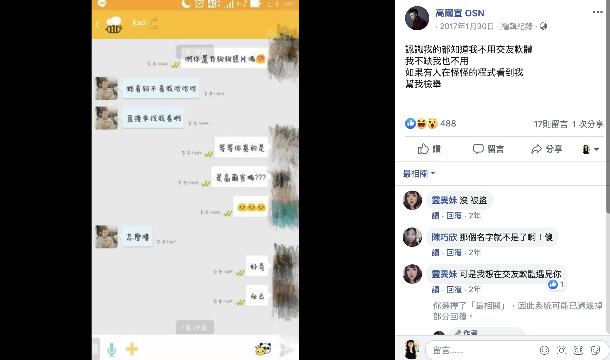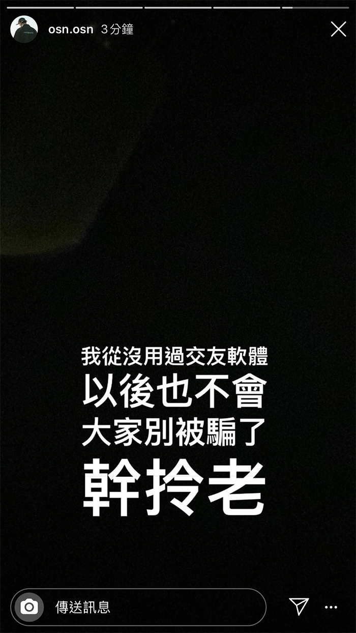 然而在分手消息曝光後,高爾宣上週日(5)在IG限時動態中突然發了一段黑底的文字,寫下:「我從沒用過交友軟體,以後也不會,大家別被騙了,幹拎老」,怒到直接飆罵髒話,而早在2017年時高爾宣就曾在臉書粉絲專頁上發文說到:「認識我的都知道我不用交友軟體,我不缺我也不用,如果有人在怪怪的程式看到我,幫我檢舉」,更附上有人盜用他的身份在beetalk的聊天畫面,時隔兩年又再度被人盜用身份。