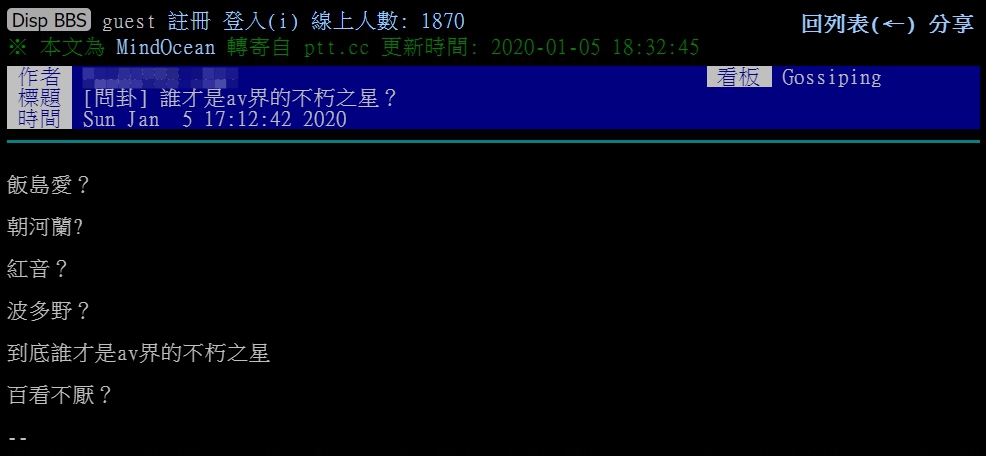 日前有網友在PTT論壇「八卦版」貼文,提問「誰才是AV界的不朽之星?」,想知道對大家來說,眾多的AV女優中,誰才是大家心目中最念念不忘的女神,而且百看不厭。他同時還列出幾位知名女優的名字,例如飯島愛、朝河蘭、紅音螢、波多野結衣等等,引來網友熱烈討論。
