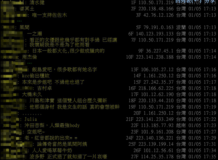 網友紛紛表示「沖田杏梨,人類最強body。」、「我講個冷門的,夏目娜娜。」、「吉村卓。」、「唯一支持佐佐木。」、「飯島愛吧,很多歌都有她名字」、「本來是步姐吧,不過她也退了」、「波多野,正式退了就知道了一片哀嚎」、「論傳奇當然是風間阿姨」、「 沒人推汁波蜜?」,還有網友歪樓到男優,「清水健,看證的女優跟他幾乎都有對手過,已經讓我懷疑我是不是為了他而看。」