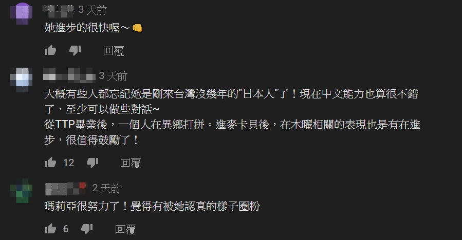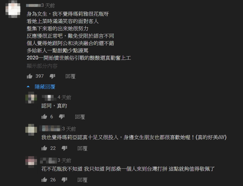 而阿部瑪利亞或許受限於語言,先前曾被認為「定位不是很明確,有種花瓶感」,但這一期節目中,她的努力也讓網友們有目共睹,紛紛稱讚「身為女生,我不覺得瑪莉亞很花瓶呀,看她上菜時滿滿笑容的面對客人,整集下來看的出來她很努力,反應慢很正常吧,難免受限於語言不同,個人覺得她跟阿公和泱泱融合的還不錯」、「完蛋了,眼精聚焦都在瑪利亞身上,我居然變心了」、「花不花瓶我不知道,我只知道,阿部桑一個人來到台灣打拼,這點就夠值得敬佩了。」