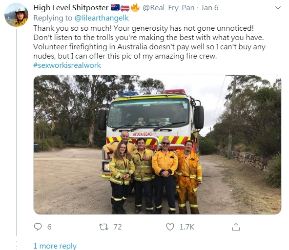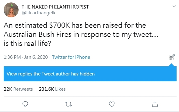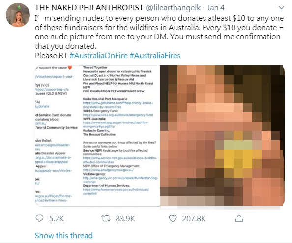 澳洲山火不只造成人類與動物傷亡,也有消防員因此而殉職,災情相當慘重。雖然這場火災源自於天災,不過澳洲輿論對於總理莫里森神隱,以及詳細災情仍然感到相當質疑。日前,來自美國洛杉磯的女模特兒「凱琳•沃德」(Kaylen Ward暫譯)認為自己可以為澳洲山火盡一己之力,所以在自己的Instagram及Twitter上發起了「只要有人捐10美元(約300台幣)給澳洲山火的相關證明,她就會寄一張裸照給捐款人士」的募款活動,結果反應相當熱烈,甚至在第一天晚上就募集到了7000美元(約21萬新台幣)。