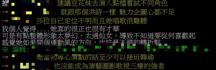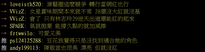 貼文一出引發網友熱烈討論,網友紛紛表示豆花妹的定位不明,出道後沒能有明顯的特色或才藝,也沒有著名的作品讓人留下印象,有網友表示:「整體形象太夢幻,太過仙女導致不知道要從何喜歡起」、「她當初專心演戲的話至少可以接班韓瑜」、「覺得只是沒找到適合她的角色」,更有網友指出「女星賞味期不長,28還沒大紅就沒機會了,只有林志玲29能逆天出道紅起來」。