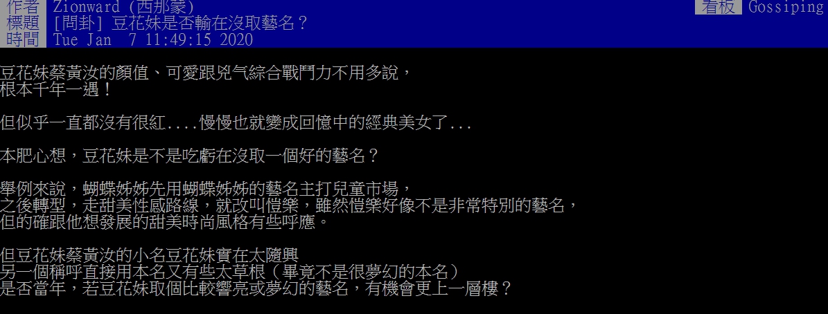 近來有網友在PTT上問卦「豆花妹是否輸在沒取藝名?」,內容表示他認為豆花妹蔡黃汝明明是千年一遇的美女,但似乎一直沒有很紅,慢慢也就變成回憶中的經典美女,這位網友懷疑條件這麼好的蔡黃汝是不是吃虧在沒能取一個好的藝名?他以蝴蝶姐姐為例,「蝴蝶姊姊先用蝴蝶姊姊的藝名主打兒童市場,之後轉型走甜美性感路線,就改叫愷樂」,表示蝴蝶姐姐成功轉型,目前已經成為知名女藝人,相較之下「豆花妹」這個小名太過隨興,改一個藝名或許「有機會更上一層樓」。