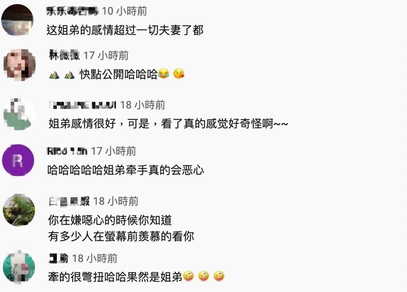 最後山山也突然起身大喊「個屁~」,一行人才發現自己遭到兩人惡整,對此網友們也紛紛留言:「哈哈哈哈哈姐弟牽手真的會噁心」、「牽的很彆扭哈哈果然是姐弟」、「姐弟感情很好,可是,看了真的感覺好奇怪啊」、「這姐弟的感情超過一切夫妻了」,引起熱烈的討論。
