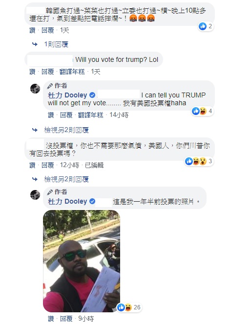其他網友看完他的影片之後,都紛紛留言表示,「韓國魚會帶你去看漂亮的小白腿」、「問題是你在臺灣十六年了,臺灣都沒有給你身份?」、「打一次就行了怎麼會重複打」、「沒投票權,你也不需要那麼氣憤,美國人,你們川普你有回去投票嗎?」、「要珍惜有投票權啊,臺灣人」、「杜力很會弄碎韓粉的玻璃」、「杜力實在太可愛囉~」、「沒看到他滿臉黑人問號嗎?」、「我秒掛,超級擾人」、「韓國瑜錢太多了!」。