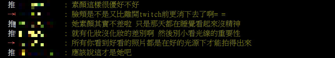對於女神形象的崩壞網友議論紛紛,有網友表示:「2014女神殞落」、「這誰,判若兩人」、「臉頰是不是又比離開twitch前更消下去了啊」、「吃鼻屎真的不行,怕」,同時也有網友替她護航:「素顏這樣很優好不好」、「她素顏其實不差啦,只是那天都在睡覺看起來沒精神」、「就有化妝沒化妝的差別」。