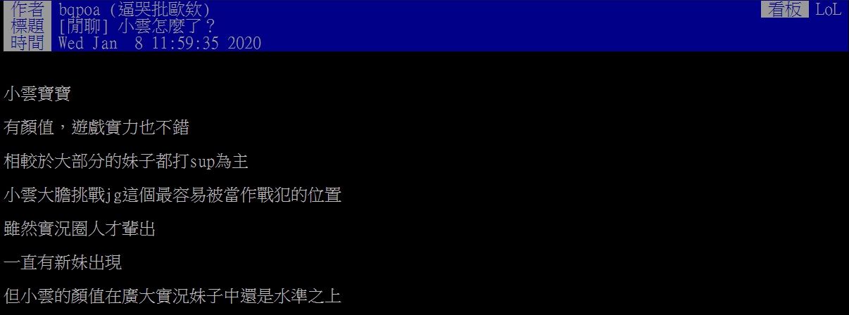 近來,有網友在PTT上發文表示「小雲怎麼了?」,這位網友表示小雲寶寶外表甜美可人,遊戲實力也不在話下,相較其他女遊戲實況主算是特別,雖然電競界美女如雲,「但小雲的顏值在廣大實況妹子中還是水準之上」,貼出一連串「印象中的她」的照片,全是小雲寶寶的性感美照,接著話鋒一轉,網友表示日前發現幾張小雲寶寶的直播截圖照片,直呼最近的小雲寶寶形象大崩壞,不只直播素顏睡覺的樣子給直播觀眾看,睡醒後還在直接在眾人面前挖鼻屎,使得這位網友感嘆女神形象一去不回,「有沒有人知道小雲怎麼了?」