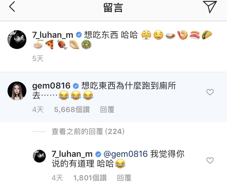 其實,鄧紫棋過去也有回覆鹿晗的貼文過,之前鹿晗曬貓咪在他行李箱上逗留,貼文中寫著,「shall we go?」鄧紫祺看完之後,整個把重點誤放在透明行李箱上,留言說,「行李被看光光,會不會吸引小偷啊?」也是讓網友們笑到不行!這次兩人先再次隔空互動,讓粉絲們看了都非常開心,也有網友跟著幫腔,「想吃東西為啥跑廁所」、「是我眼瞎吗?我是真的看到了馬桶這個東西嗎?」也有人對於鹿晗久違的自拍激動的說,「終於看見你發自拍了,哥哥要經常更新ins~」
